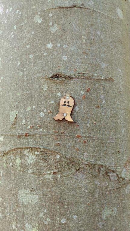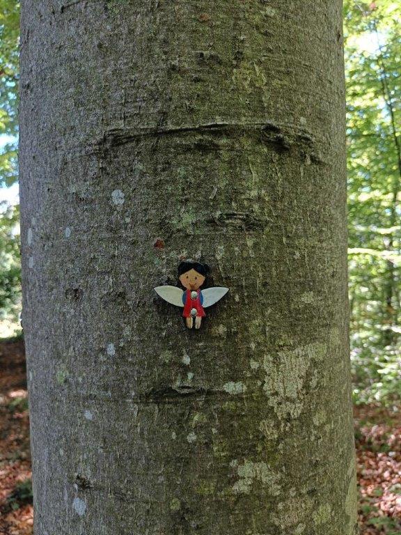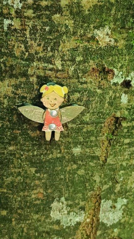 Ein wunderschöner Waldpfad schlängelt sich vorbei an winzigen Wichteln, Feen und Geister, die an Bäumen hängen.